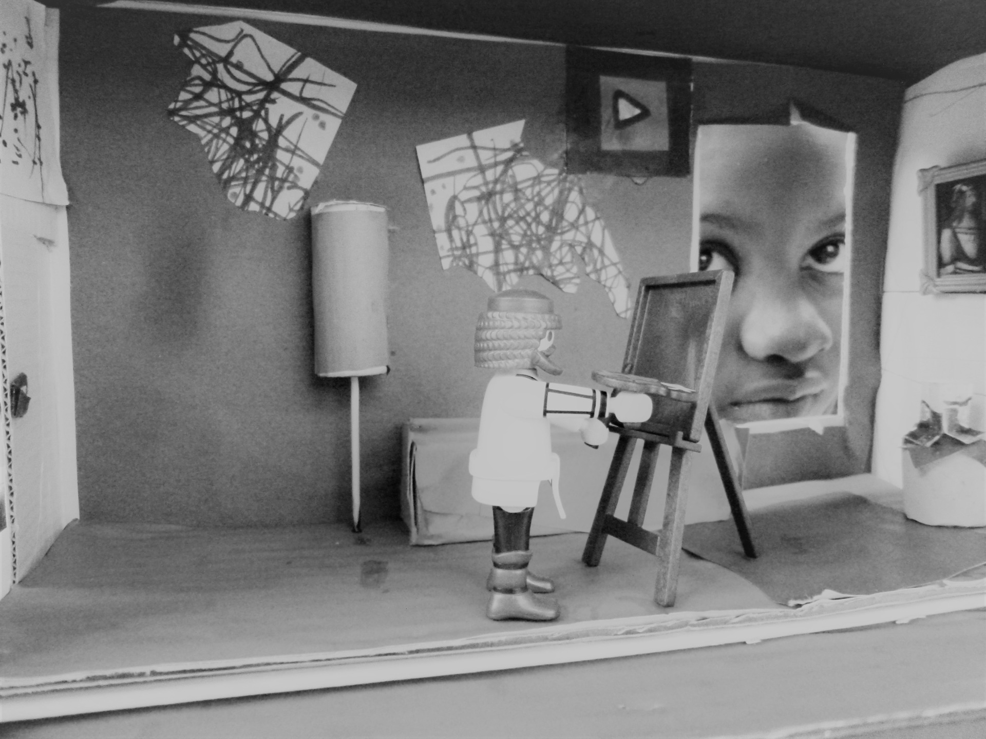 Travail sur les ouvertures, portes et fenêtres (seuls les adultes manipulent le cutter pour cette phase), sur les murs, plafond et sol (choix des couleurs, matériaux) puis du mobilier (table, chevalet, chaise, armoire, etc…) ainsi que les accessoires (rideaux, lampe, outils, etc…) tout en veillant à conserver les proportions de chaque élément l’un par rapport à l’autre.